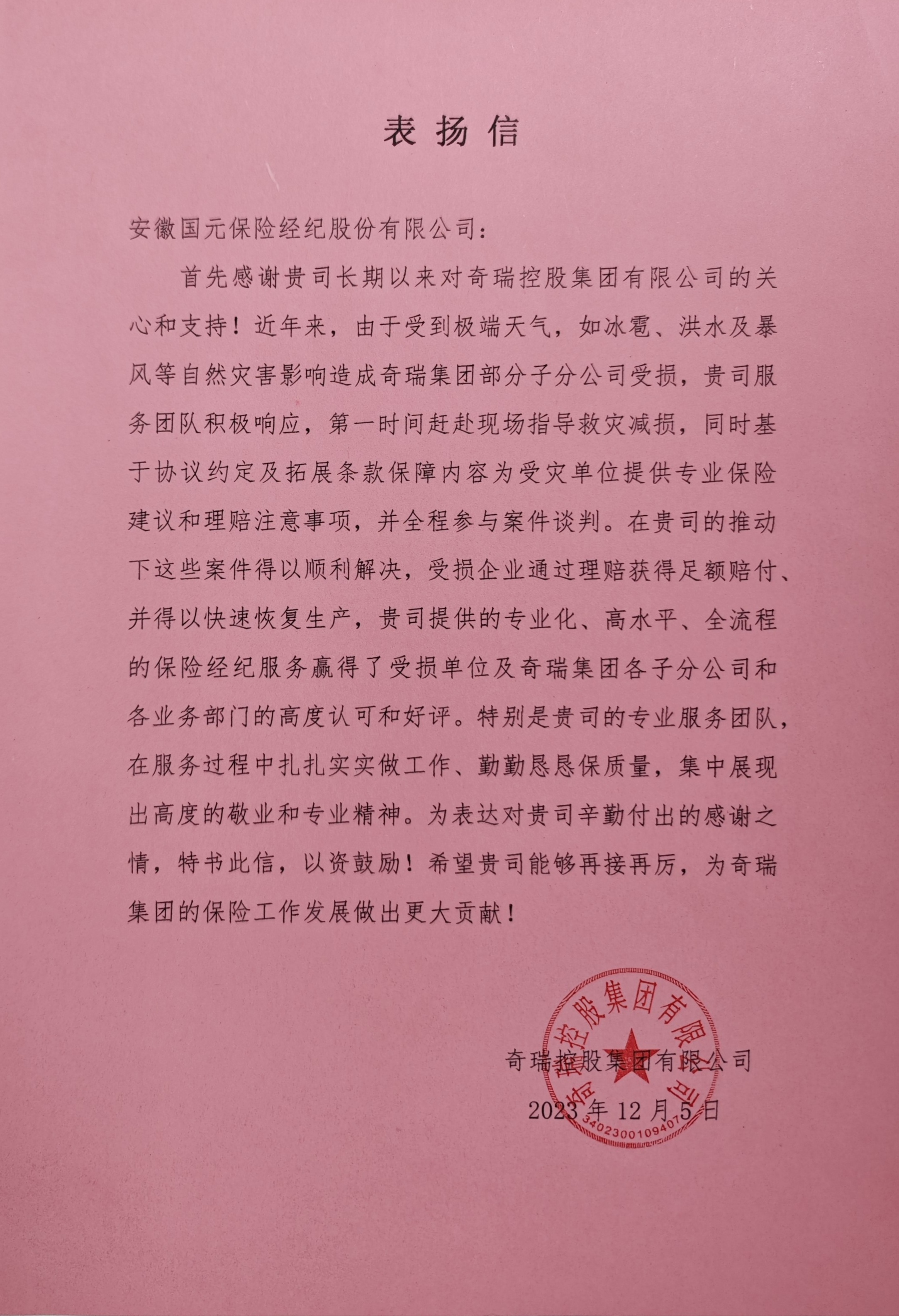 奇瑞集團(tuán)在表揚(yáng)信中特別提到,國元保險經(jīng)紀(jì)在服務(wù)過程中扎實(shí)工作,勤勉盡責(zé),展現(xiàn)出高度的敬業(yè)和專業(yè)精神,贏得了受損單位、奇瑞集團(tuán)各子分公司及各業(yè)務(wù)部門的高度認(rèn)可和好評。